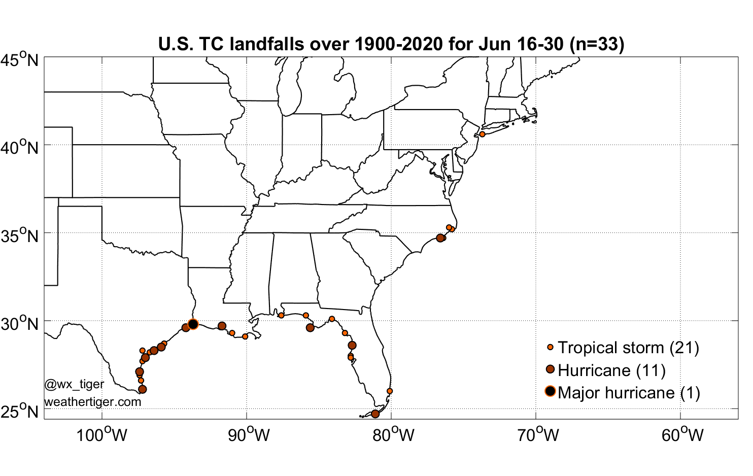 Agnes is the sole late June storm since 1900 to strike north of North Carolina (above). The western Gulf is the historical focus of tropical risks over the next couple weeks.
