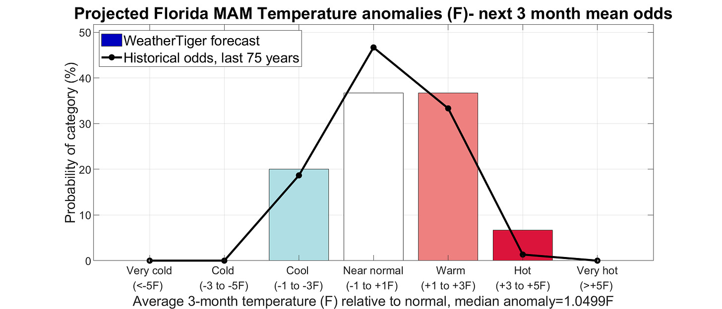 This is a fairly high confidence forecast, though there is more uncertainty at in late spring as it’s not clear whether a La Nina overhang to global weather patterns will dissipate heading into early summer. For what it’s worth, WeatherTiger’s expectations for winter were generally met: we called for a most likely outcome of about 60% of normal rainfall in Florida, and most of the state did indeed see 50-80% of normal precip. (Though of course, well above “normal” in sleet and snow.) Winter temps surprised a bit on the cooler side at mostly 0-1F above normal, averaging out a normal December, very cold January, and very mild February. I had put 30% odds on average temps within a degree of normal, and a most likely anomaly of +1.6F above average.