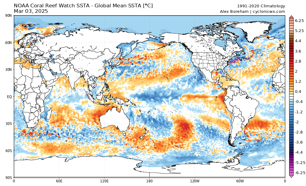 Beneath the surface, the Equatorial Pacific is mostly cooler than average down to a few hundred meters’ depth, despite some notable surface warmth showing up in the last 2-4 weeks close to South America. With stronger than average trade winds expected over the next few weeks, this patch should cool off a bit, and there is no indication of a rapid transition to El Nino afoot.