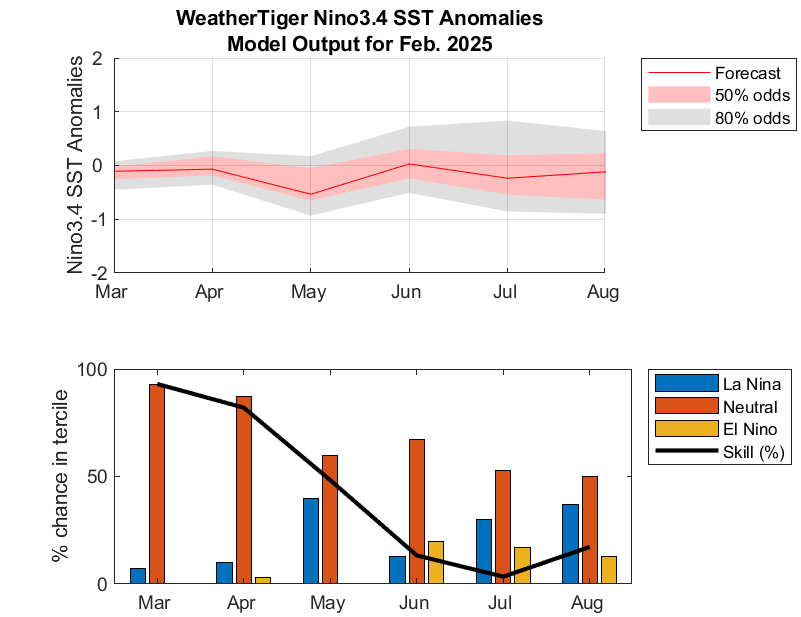 WeatherTiger’s in-house El Nino/La Nina modeling, along with pretty much all other guidance, has been consistent in predicting the demise of the ongoing La Nina in spring 2025, perhaps as soon as… now. Our latest model run suggests that neutral conditions are likely to return no later than April, with cool-neutral conditions persisting through summer. While spring is a time of deep uncertainty in El Nino/La Nina forecasting, the probabilities of El Nino development, which would act as a brake on the 2025 hurricane season, remain minimal.