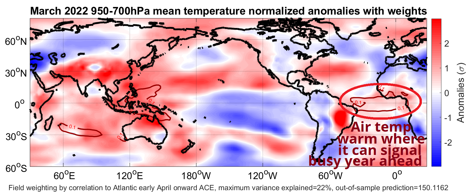 Another spring outlook consideration, secondary to ENSO, is Atlantic water temperature anomalies. Historically, the strongest relationships between Atlantic warmth in spring and an active hurricane season are found between the Gold Coast and eastern Brazil. Warm spring waters there often migrate north into the Main Development Region from West Africa to Central America by the hurricane season’s peak, promoting more frequent development of tropical waves.