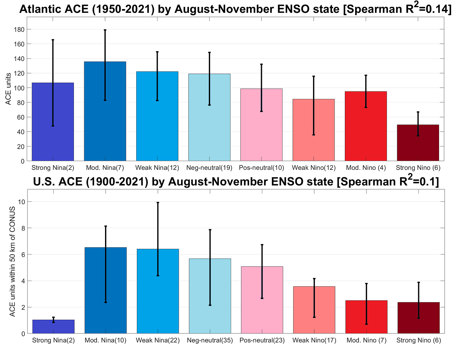 The primary source of this limited predictive power is the tendency of abnormally warm (El Niño) or cool (La Niña) waters in the equatorial Pacific, collectively known as the El Niño-Southern Oscillation (ENSO), to persist into the peak of hurricane season. Atlantic hurricane activity has a strong relationship with ENSO, as fall El Niños are linked to hurricane-weakening wind shear in the Atlantic. Thus, La Niña hurricane seasons average about 75% more ACE than El Niño years. The disparity is even more stark in terms of impacts, with La Niñas averaging over twice as much U.S. landfall activity as El Niños since 1900. Unfortunately, projections of long-range ENSO conditions face a “predictability barrier” of diminished forecast skill in the spring. Sudden shifts in the Pacific are most common at this time of year, and have outsized, long-lasting implications for global weather patterns.