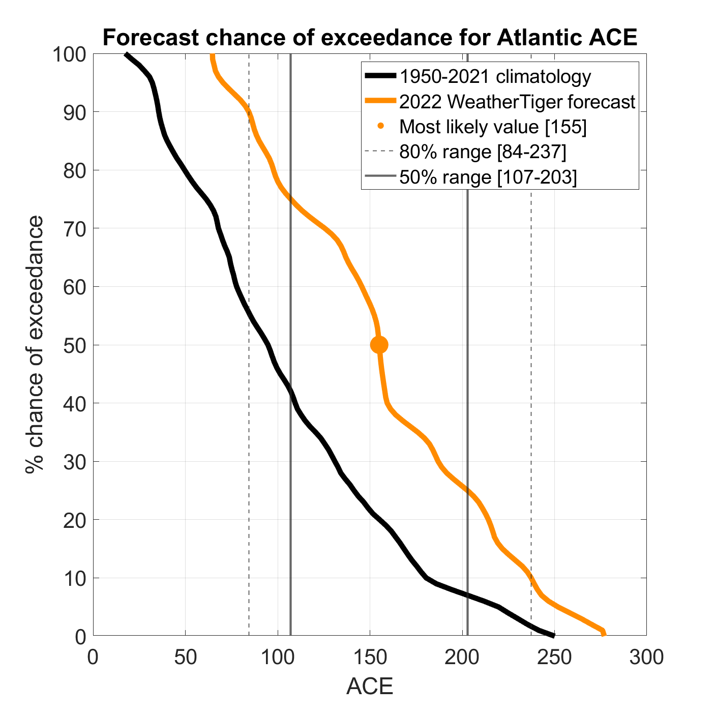 WeatherTiger’s initial forecast for the 2022 Atlantic hurricane season offers limited hope of more typical threats in the year ahead. Our seasonal forecasting algorithm projects a most likely outcome of around 155% of average activity. Over the last fifty years, normal ACE is 100 units per season, so our forecast for a most likely outcome of around 155 ACE units in 2022 is halfway between the final tallies of 2020 and 2021.