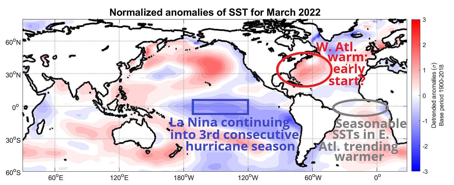 This spring, water temperatures in the equatorial eastern Atlantic are near normal. However, near-surface air temperatures in this region in March were mostly above average. This signals the presumptive start of a trend towards Atlantic SSTs warmer than average by summer, a pattern that has repeated several times in the last six years. Fool me once, shame on me; fool me twice, won’t get fooled again.