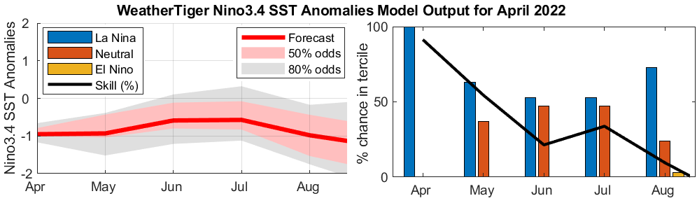 This year, a historically unusual moderate La Niña is the key to the forecast. La Niña events most often last one or two winters, with only three triple dips in the last 75 years, most recently when a 1998 Niña was also taking over for the ’99 and the 2000 like Cash Money Records. Earlier this year, the cold pool waned and it appeared the typical demise of a second-winter Niña was at hand; however, cool anomalies in the Pacific have since backed themselves up to around 1⁰C below normal, and La Niña is looking like a good bet for a third consecutive summer per WeatherTiger’s ENSO models. With no significant reserve of warmer water lurking below the surface of the Pacific, there is more confidence than usual in La Niña or at the very least cool-neutral conditions lasting into fall and setting up a busy Atlantic hurricane season.