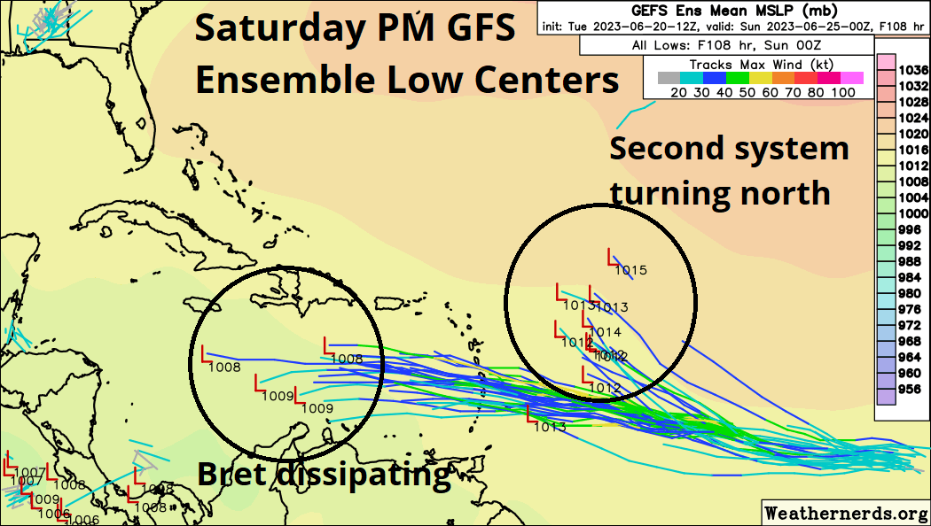 But wait, there’s more! To Bret’s east is yet another well-organized tropical wave, blithely spinning away as if this was early September. Storm activity is a bit anemic with this disturbance (Invest 93L) today, but slow development into a tropical depression or tropical storm is likely by Friday as the wave moves west-northwest through a favorable environment. While the eventual development of Tropical Storm Cindy is probable, this system will turn north over the weekend towards a break in the Bermuda high and should move out-to-sea early next week without affecting land areas.