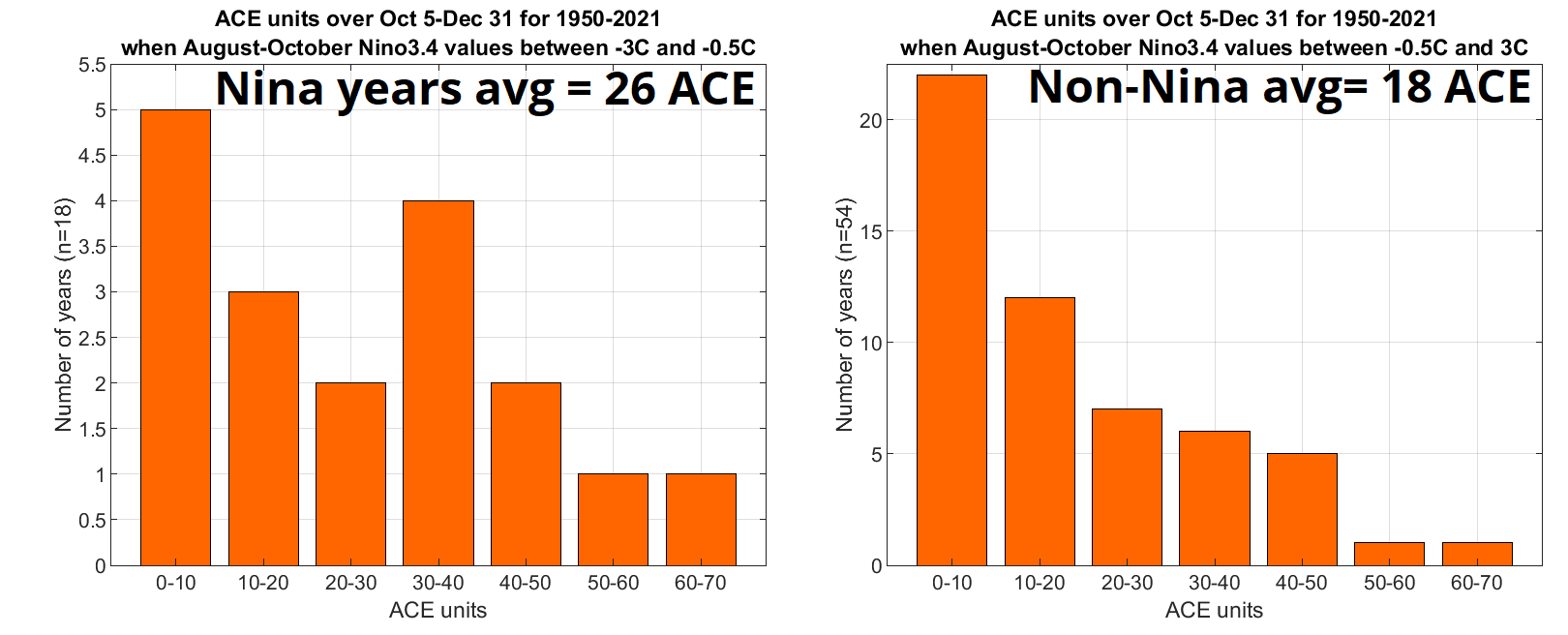 Unfortunately, there are some signs that the environment there may be a little more favorable than usual for tropical activity this October and November. Not only does the western Caribbean remain much warmer than average, but an ongoing moderate La Nina is likely to keep fall wind shear below average in these areas as well. Climatologically, hurricane seasons with an ongoing La Nina have around 50% more Accumulated Cyclone Energy (ACE) and major hurricane activity after October 5th than those that do not.