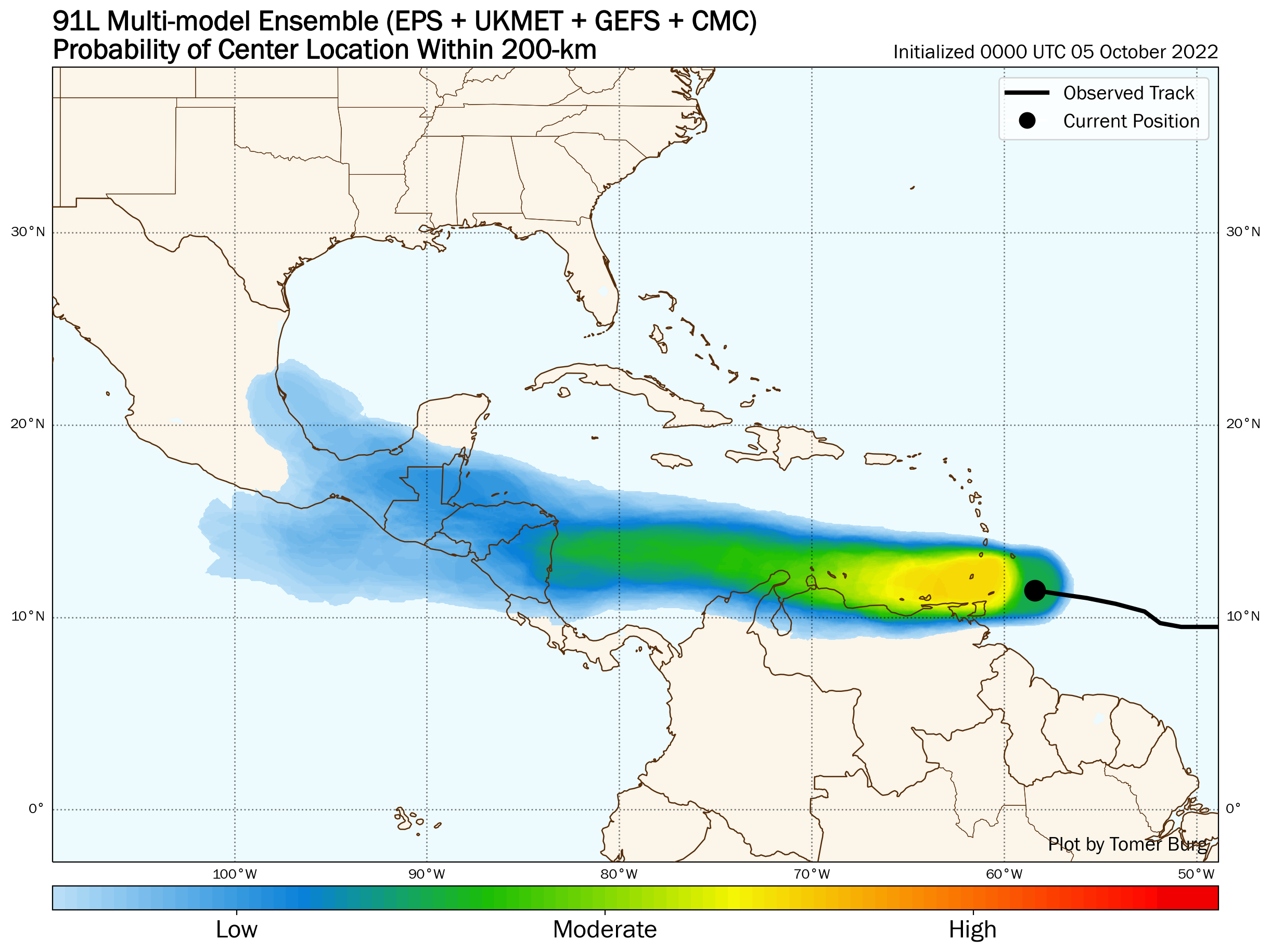 Instead, subtropical high pressure will be in place over the Gulf of Mexico and western Atlantic into late next week. The clockwise steering winds around this ridge will prevent any Ian-like turn north towards the U.S., and keep 91L hustling westward into Belize, Honduras, or Nicaragua by Monday. If 91L bears more west-northwest and spends a bit longer over water, it may attain hurricane strength prior to reaching Central America.