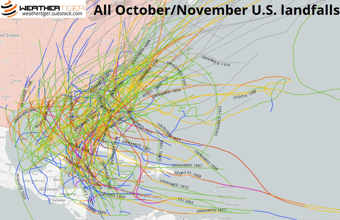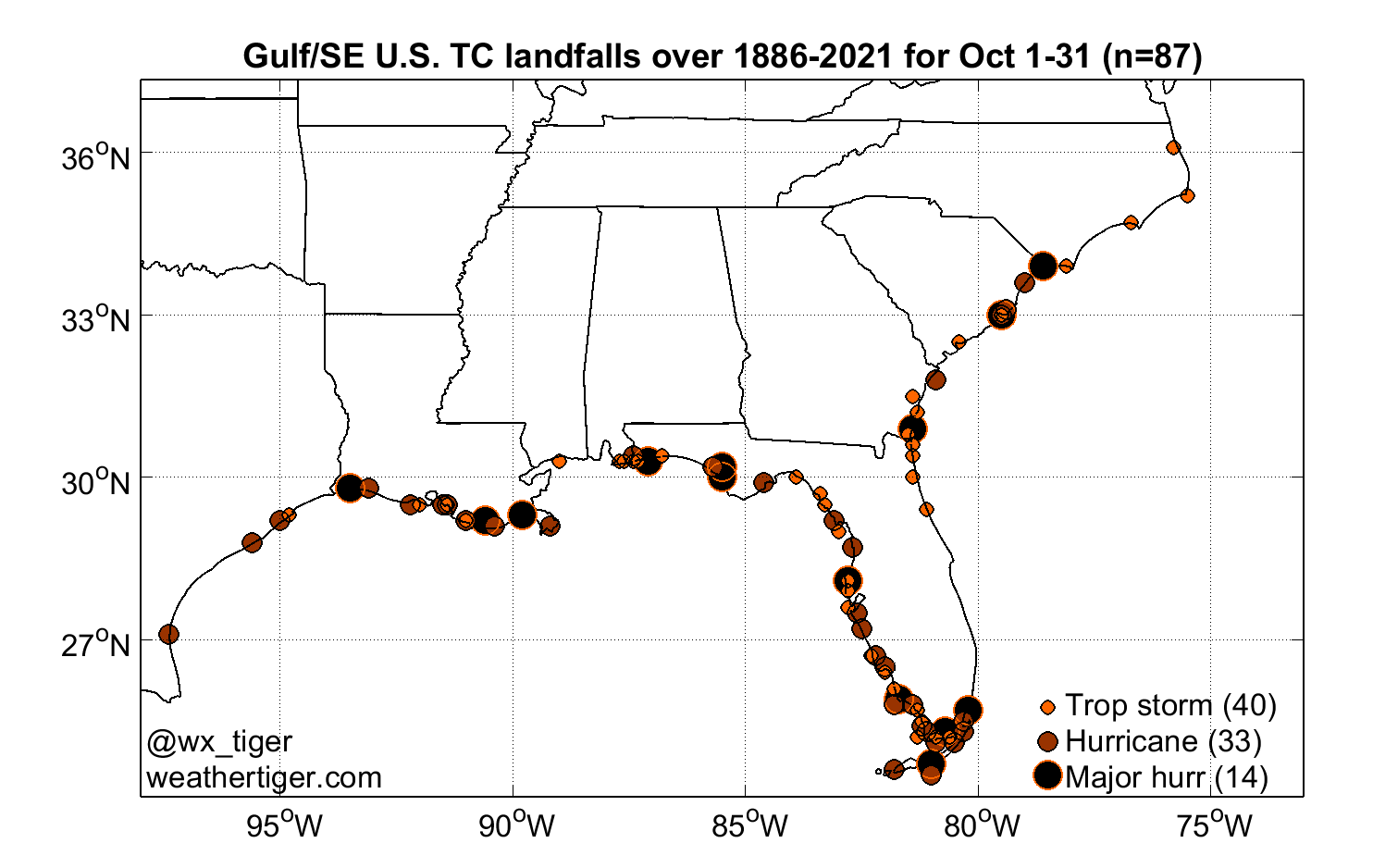 So, while November storms like 1985’s Hurricane Kate show the late-season odds of November tropical trouble are non-zero, there are three more weeks before the historical rates of U.S. landfalls fall off a cliff. More or less.