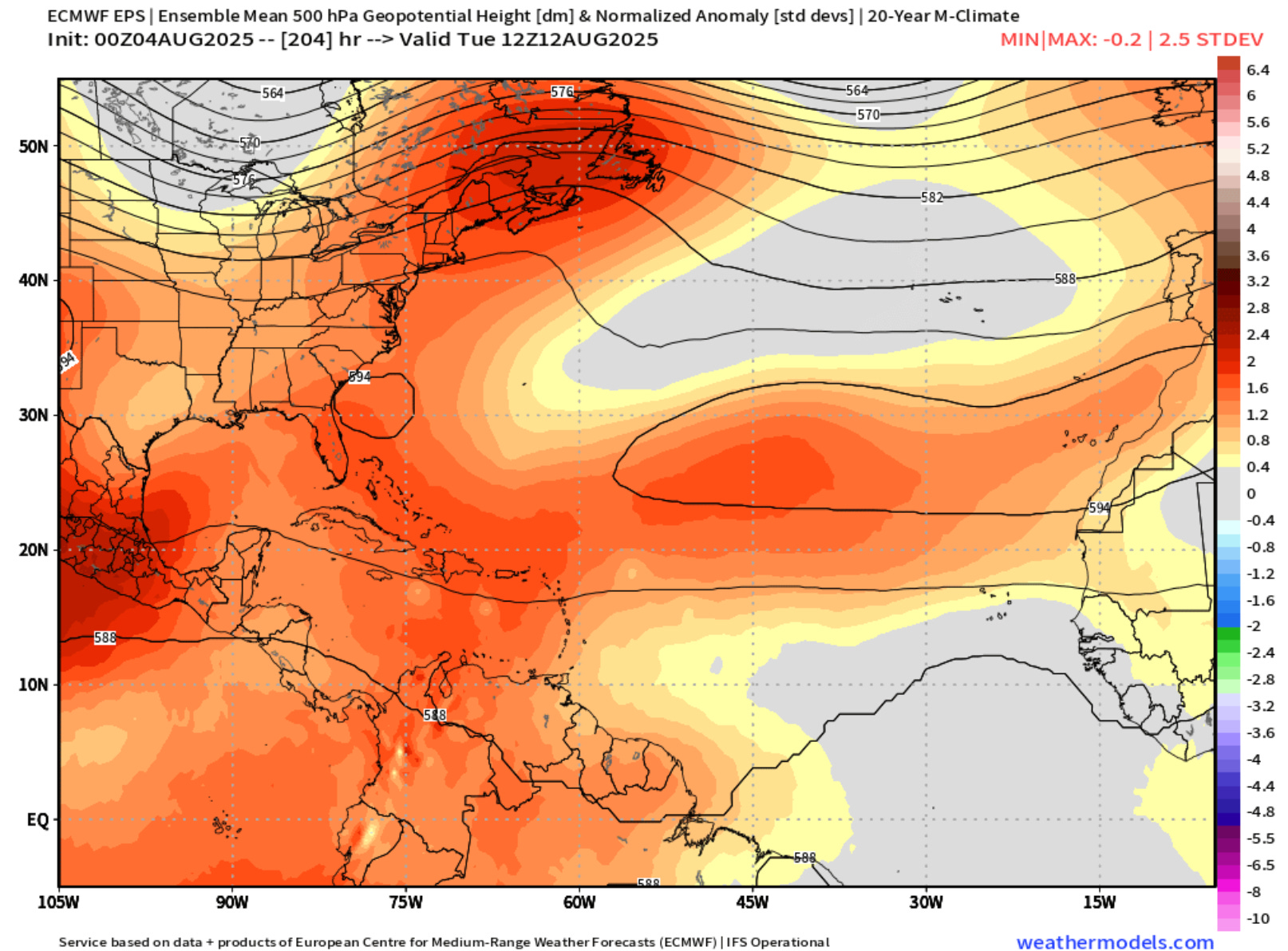 Monday morning Eastern Atlantic visible satellite imagery showing a new tropical wave between 15-20W. (CyclonicWx.com) While both the GFS and European ensembles show solid support for development, they differ in how they handle this wave beyond day 5. The Euro sends the developing system northwest and out-to-sea into a central Atlantic break in subtropical ridging, while the GFS turns the wave back to the west over the weekend under a strong lobe of western Atlantic ridging. We’ll see how things shake out over the next few days as the disturbance gets better defined, though I will note that the continental U.S. pattern may feature frequent East Coast/ Western Atlantic high pressure in mid- and late August. If a coherent tropical feature can make it past 60W and slip under the ridging, that would be something to watch. Stay tuned, but nothing to worry about as yet.