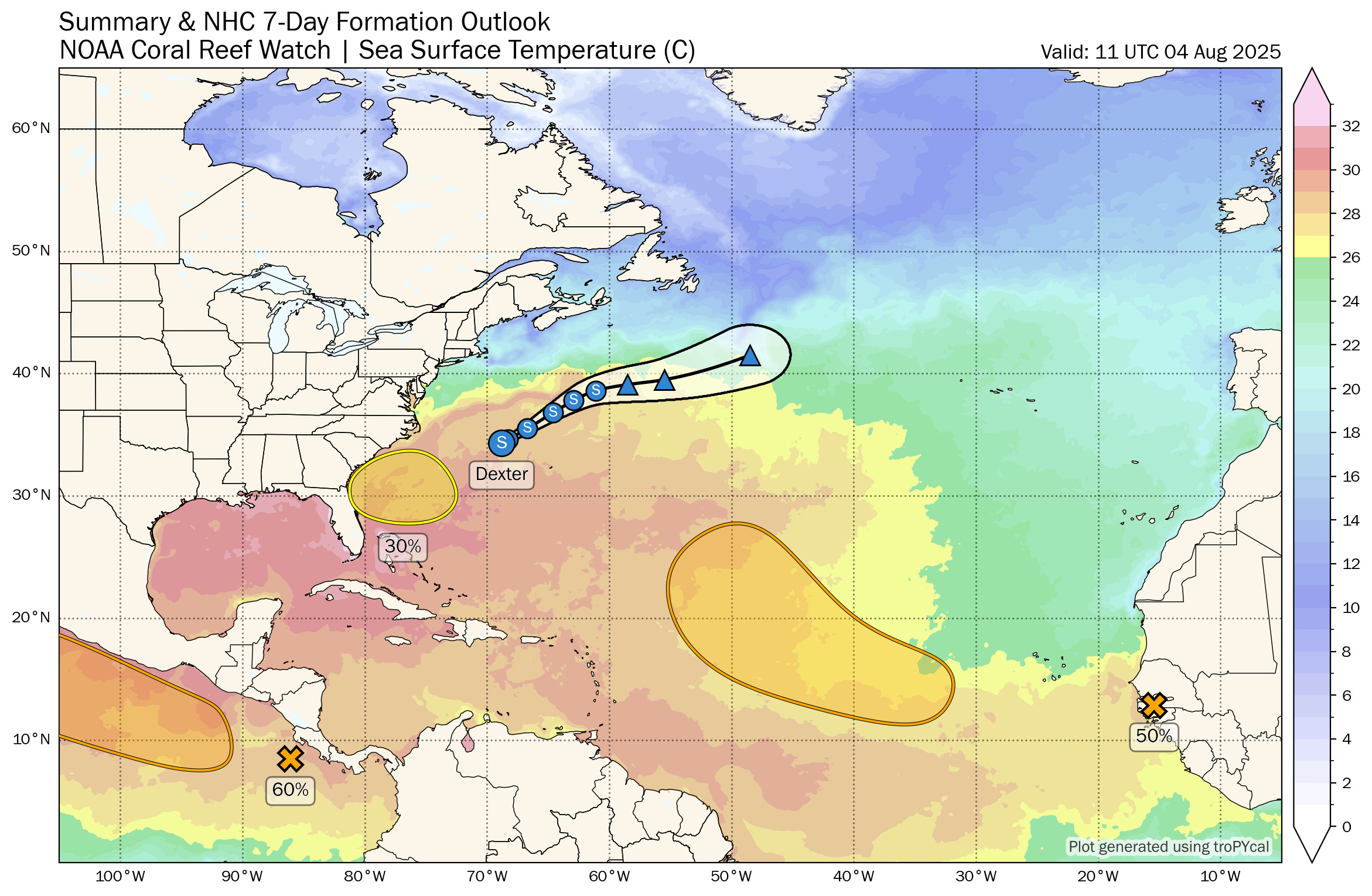 Active Storms: As I mentioned was a possibility early last week before being felled by viruses, a stalled frontal boundary over the very warm Gulf Stream has given rise to Tropical Storm Dexter, which is currently about 600 miles east of the Outer Banks of North Carolina. Dexter has maximum sustained winds of 45 mph this morning and is shuffling east-northeast away from land at about 10 mph. Dexter will pass well north of Bermuda late today and should become post-tropical midweek in the open Atlantic. This is no threat to any landmass— it is Tropical Storm Dexter, not Tropical Storm Sinister, after all (Latin humor!).