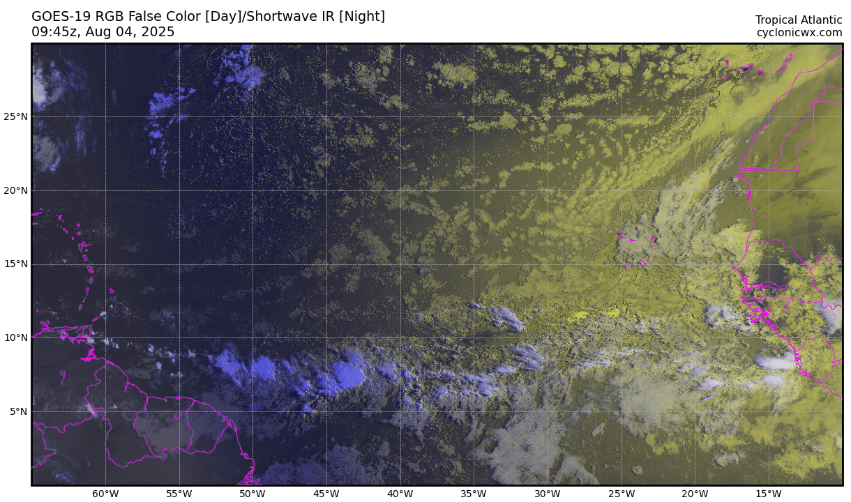 Finally, something to watch in the longer term is a tropical wave just emerging from the West African coast today. There’s nothing visually impressive about this wave right now, but this morning’s NHC Tropical Weather Outlook has it at an eventual 50% chance of development over the next week. That’s because there’s a notable envelope of mid-level moisture and low-level rotation associated with this wave, and with vertical wind shear dropping and dust clearing out of the Eastern Atlantic, there’s a decent set-up for the first realistic shot at Main Development Region storm formation in 2025 four to seven days from now.