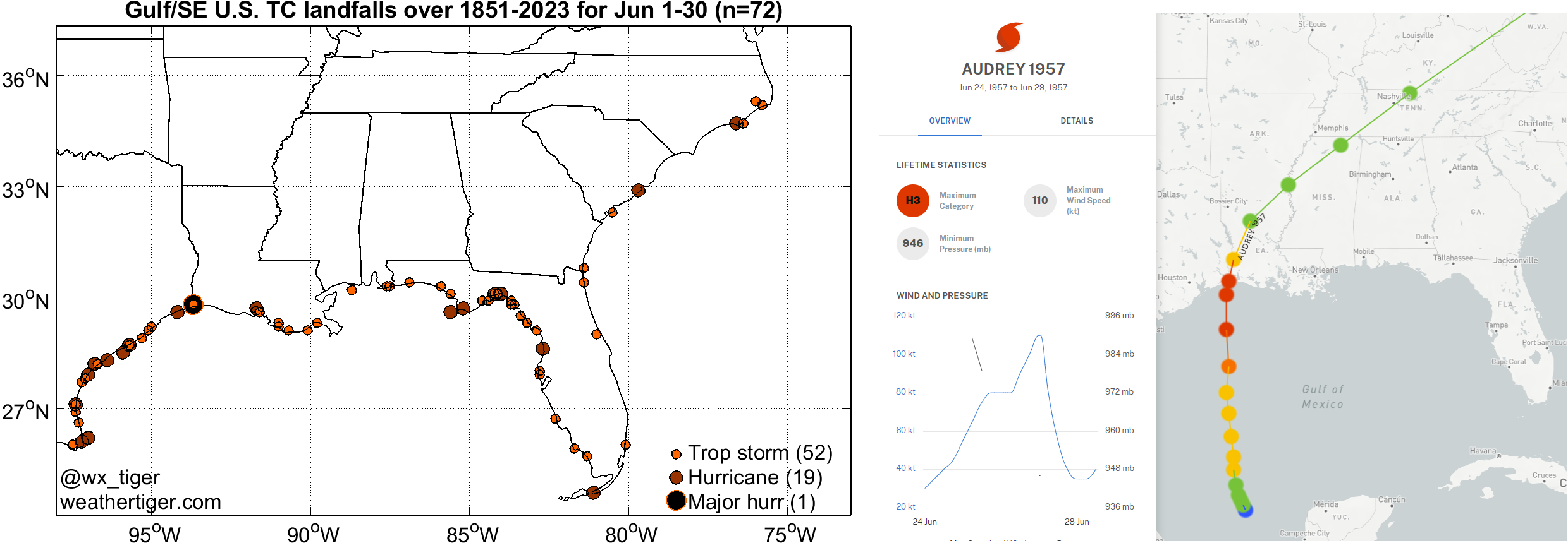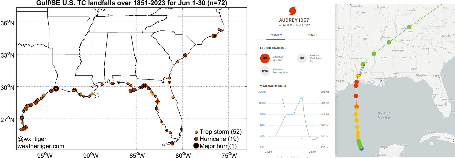 Today is the 67th anniversary of the only June major hurricane strike in the continental U.S. on record, 1957’s Category 3 Hurricane Audrey. Making landfall on the Texas-Louisiana border, Audrey rapidly intensified overnight in the hours before reaching shore, and thus caught the Gulf Coast by surprise with its ferocity. Audrey is a destructive and deadly storm, likely responsible for 500 or more storm surge deaths.