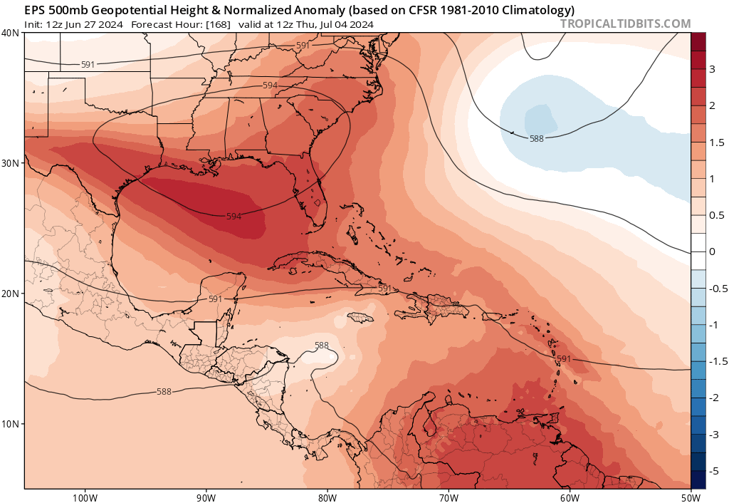 The prognosis for this one hasn’t changed all that much in the last day. A tropical storm is likely to develop over the weekend east of the Lesser Antilles as 95L moves west into a pocket of very favorable outflow and anomalously warm water temperatures in the mid-80s, with a peak at low-end hurricane intensity not out of the question as it approaches the islands on Monday. Models have backed off since yesterday on some of the wackier solutions in which a stronger storm turns north earlier, and there is now decent consensus on a track through the Windward Islands and into the eastern Caribbean. With brisk trade winds, 95L will probably zip west or west-northwestward through the Caribbean midweek; models suggest that the system will not dissipate, but nor is it likely to strengthen further. The Gulf Coast ridging I discussed yesterday is holding firm on today’s guidance (see below), so Caribbean steering winds remain mostly east-to-west, and 95L will most likely approach the Yucatan peninsula or Central America in 7-9 days. Bottom line, 95L is certainly a threat to the southern Lesser Antilles, but there is no credible risk to Puerto Rico or the continental U.S. at this time.