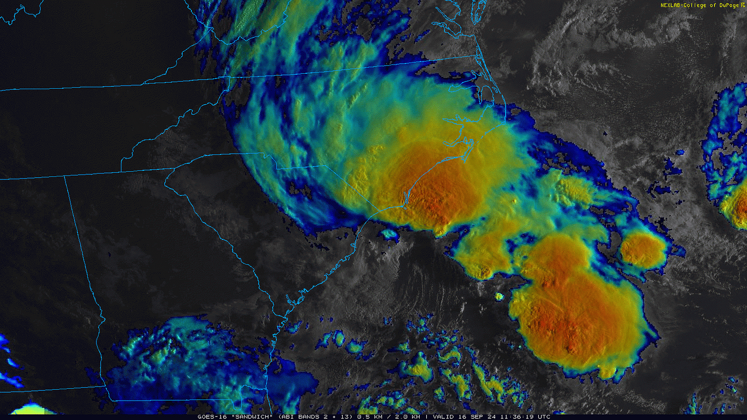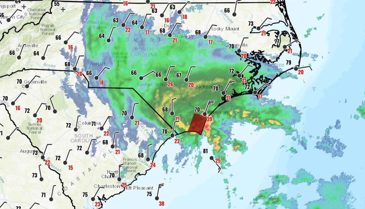 Winds, gusts, and radar for PTC8 as of 9:30 a.m. Monday. Flash Flood Warning in red. Click here for latest warnings from NWS Wilmington. If you’re wondering why this is still a “potential tropical cyclone” rather than a subtropical or tropical storm, the answer is that PTC 8 still has a couple of fronts connected to the center of circulation. As seen above, that center is also removed to the south of the deep convection. PTC 8 still may claim the name of Helene today before moving inland, but as of right now, its structure isn’t cleanly tropical enough to earn the title. Either way, that distinction doesn’t change the impacts on land, which are in line with what we’d look for from a moderate tropical storm.