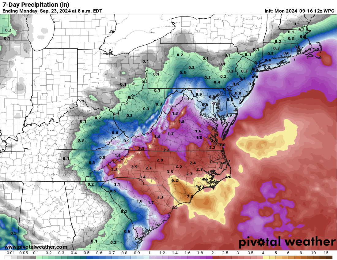 PTC 8 is moving slowly northwest this morning, and should reach land near the NC/SC border in the next 12-24 hours. Heavy rain is already onshore in southeastern North Carolina and eastern South Carolina, where storm totals of 4-8” are expected, bringing flash flood risks to Wilmington on the 25th anniversary of Floyd’s flooding. In fact, a Flash Flood Warning is currently in effect in Wilmington as of 9 a.m. ET; in general, try to stay off the roads in the coastal Carolinas today. Top wind gusts from Myrtle Beach into the southern Outer Banks so far have generally been in the 35-55 mph range, with similar intermittent gusts continuing through this evening. PTC8 should be moving north at a better clip inland tomorrow, spreading rains into mid-week to the eastern mid-Atlantic.