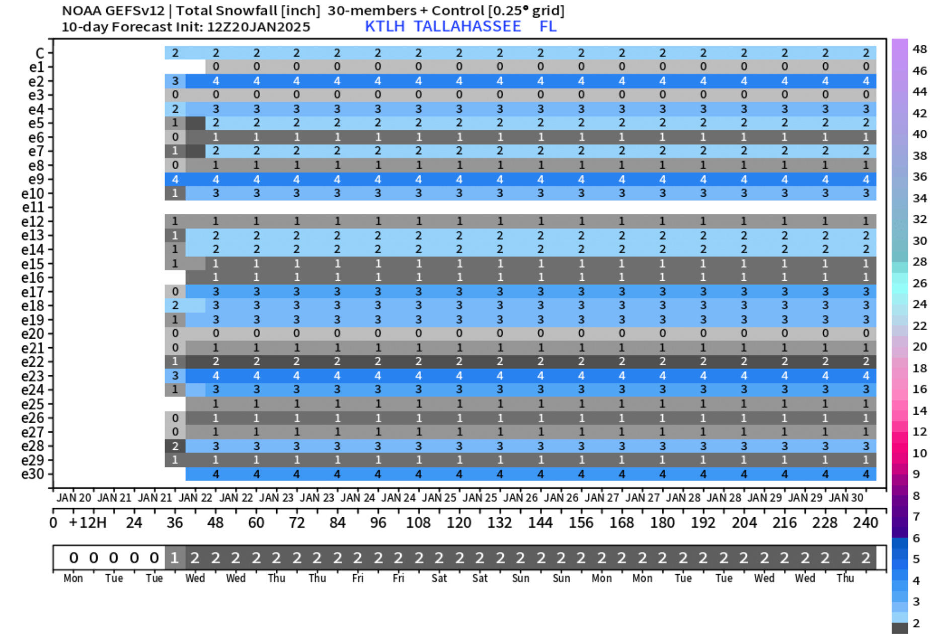 There are two major uncertainties to discuss for Florida. The first is precipitation amount. Model ensembles have trended higher over the last few days and are now in good agreement that the Panhandle will see anywhere from 0.25” to 1” of liquid-equivalent precipitation (that means if you melted down snow or ice), heaviest towards Jacksonville and lighter towards Pensacola. Tallahassee sits on a sharp gradient in expected totals, with around 0.5” most probable, but some models showing closer to 1”.