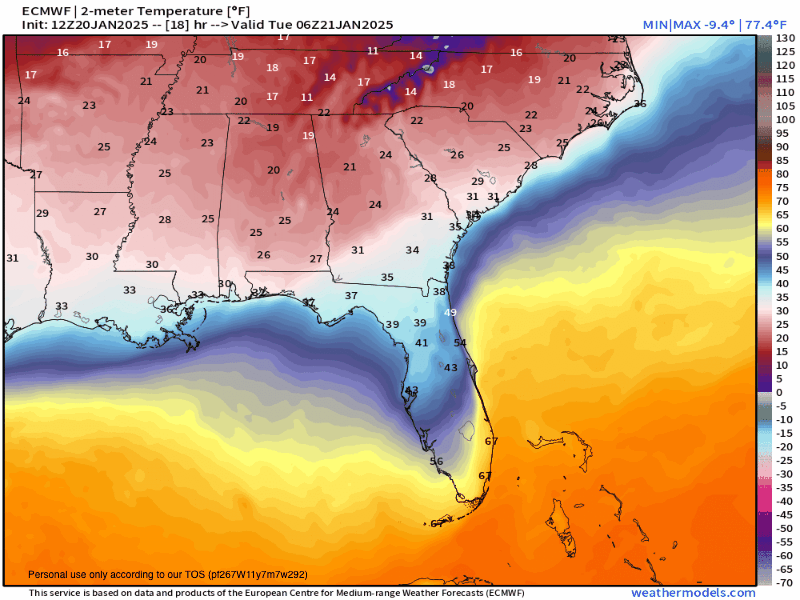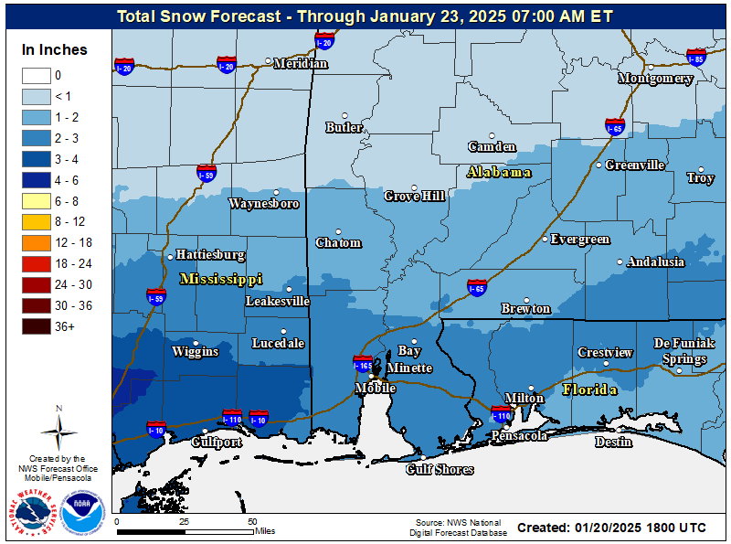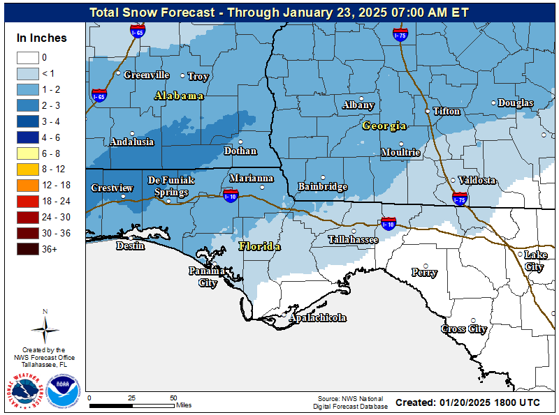 In general, this region can look for the onset of occasional light mix or snow Tuesday morning, with the heaviest snow moving through Tuesday afternoon and evening. In general, 1-2” total snow accumulations inland are the best bet, though local totals to 3” or even more wouldn’t be surprising. Snow on the beach in the western Panhandle is probable, though accumulations will be lower on the coast. For what it’s worth, Florida’s all-time single-storm snow record is 4”, set in Milton on March 6, 1954. Snow should taper to flurries and end by very early Wednesday morning.