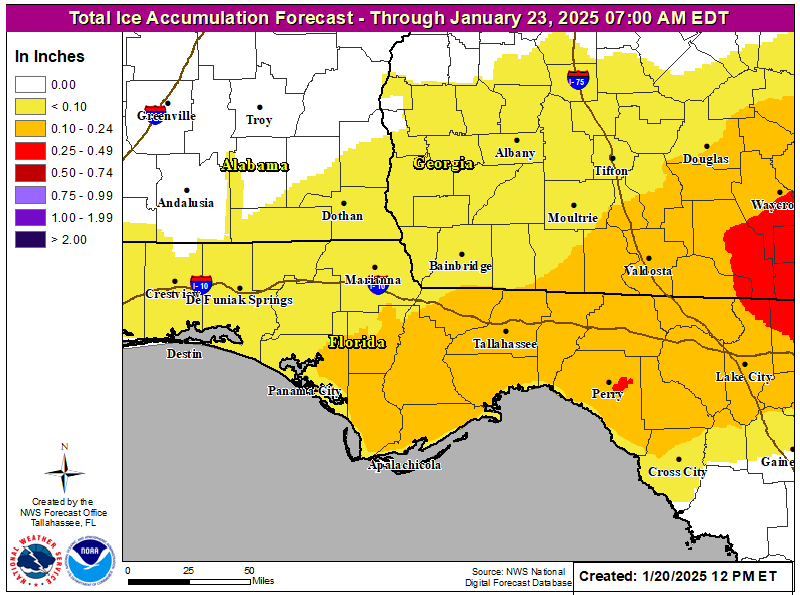 With the freezing line aloft likely cutting right through the Big Bend, I hesitate to put a fine point on the precipitation type and amounts forecast yet. If the precip can manage to stay snow more of the time, the potential for 1-3” snow totals (or more? Am I really typing this???) is there, particularly closer to the Apalachicola River or Florida-Georgia line. Realistically, especially in the eastern Big Bend, some snow is a good possibility at the beginning and end of the storm, but a period of freezing rain or sleet is probable overnight as temps at the surface are below freezing but a warm nose above the surface pokes just above freezing. If that happens, up to 0.25” of glaze or ice pellets is possible. Basically, It’s going to go right down to the wire for precipitation type in the eastern Panhandle, so please manifest and visualize snow. Let’s hope for more Snolepocalypse, less Tallahassleet or icing.