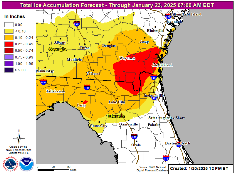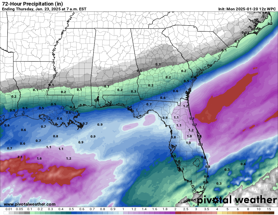 That amount of precipitation falling as all or mostly snow or ice in North Florida is borderline unprecedented. For instance, in the December 1989 snowstorm, Tallahassee and Jacksonville saw 1” and 2.5” of snow from 0.1” and 0.35” of liquid equivalent, respectively. No matter where we fall in the forecast range, we’re really working with a lot of moisture for how cold it will be, which means a lot of potential for mischief.
