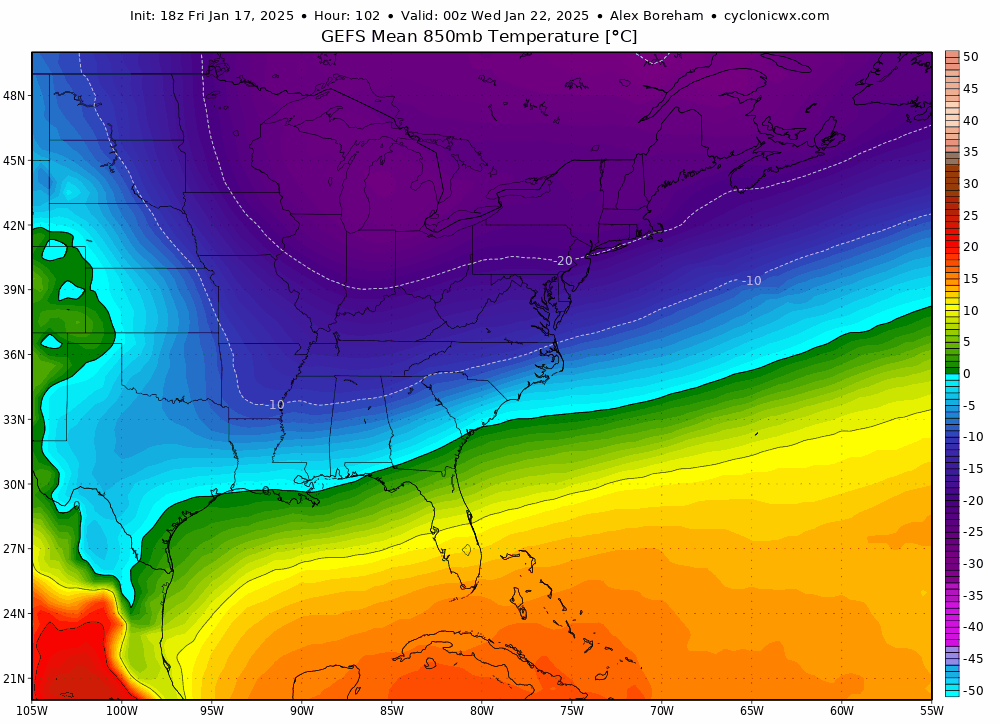 This is going to be an historic storm any way you slice the cake, but the worst impacts will be if the majority of precipitation falls as a freezing rain that ices over roads, powerlines, and trees that have been repeatedly pulled this way and that in the past decade by hurricanes, tornadoes, and severe thunderstorms. The good news is that ensemble guidance through mid-day Monday has a slight colder trend in temperatures aloft as the event approaches. However, even factoring in this trend, North Florida will be the battleground between multiple precipitation types Tuesday night into Wednesday morning.