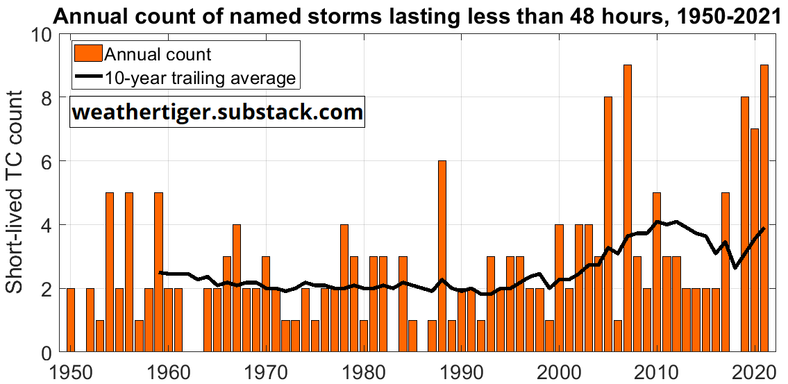 Thus far, the 2022 hurricane season has been all shorties, all the time—three for three, counting the short, happy life of Tropical Storm Alex in early June. If you’re thinking these brief candles seem more common of late, you are correct: since 2019, there have been a record 27 shorties. More broadly, while Atlantic hurricane seasons averaged two shorties per year over 1950-2000, that number has since doubled to four per season. What’s going on here? Has something changed at the NHC? Is this increase another example of hyperinflation, the economic term describing what you need to do to your tires to improve gas mileage 0.2%? Is Jerome “Boom Boom” Powell to blame?