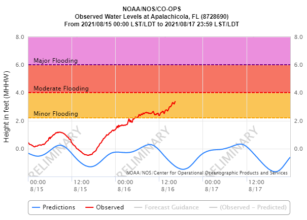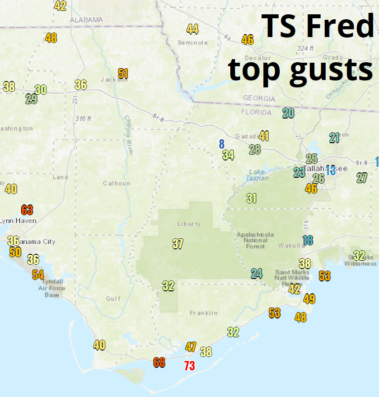 Fred’s packed punch was most keenly felt on the Forgotten Coast between Panama City Beach and Bald Point, where wind gusts peaked out between 60 to 75 mph and storm surge, highest in western Apalachee Bay, exceeded 4.5 feet. Low tide was fortuitously timed near maximum surge, but even so, localized coastal flooding occurred in Bay, Gulf, and Franklin Counties.