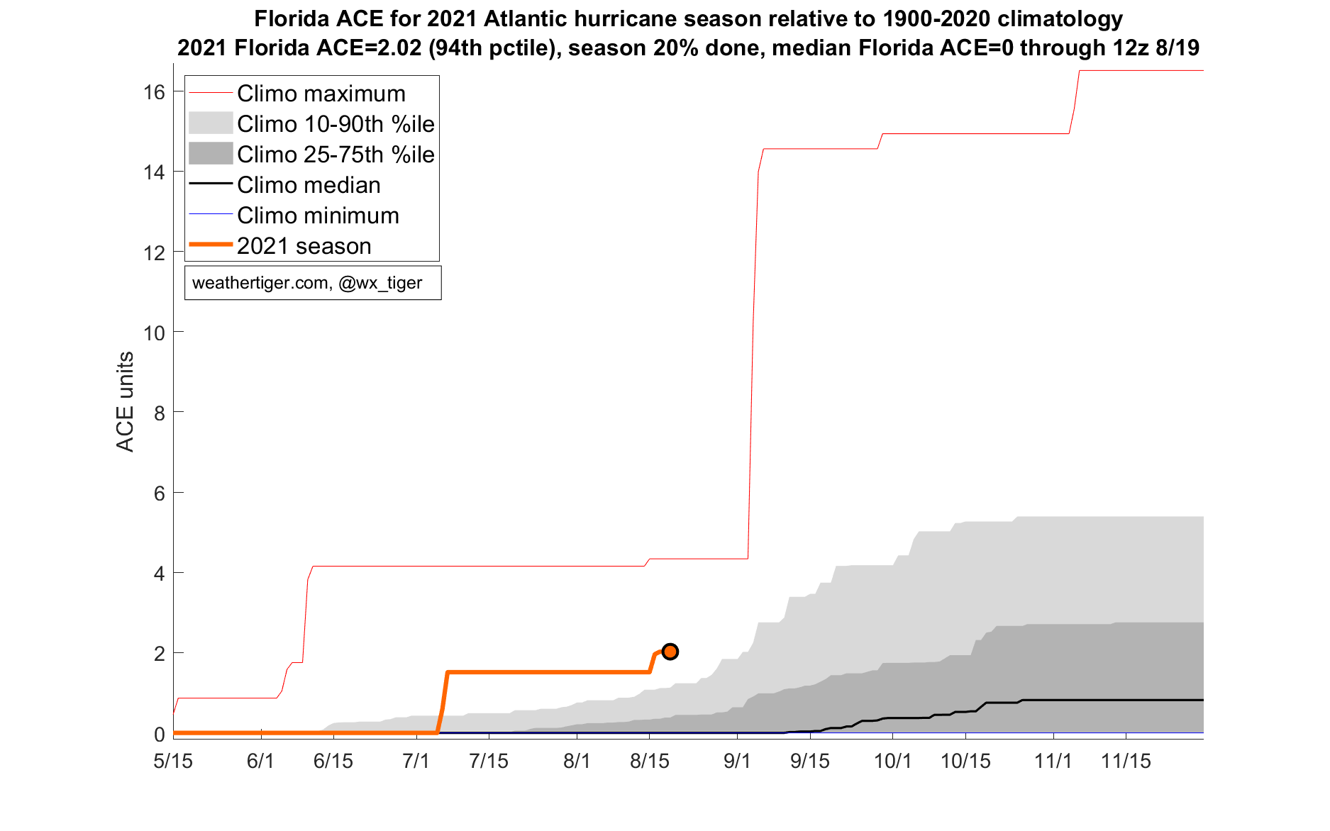 Tallying the intensity and duration of Elsa and Fred’s landfalls, the first 20% of Florida’s hurricane season has been unusually busy—more active than about 19 of every 20 years since 1900. The Atlantic has been more active than about four out of every five years through the first two-thirds of August.