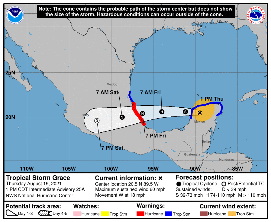 The good news is while the Atlantic is active as this climatological five-pound bag approaches, there are no threats to Florida over the next five to seven days. Hurricane Grace struck the Yucatan peninsula as a Category 1 on Thursday morning, and will continue west for a second landfall on the south-central Mexican Gulf Coast late Friday. No U.S. impacts will occur from Grace other than rip current-enhancing southerly swells along the Gulf Coast through the weekend.