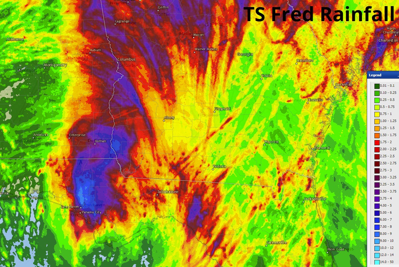 Inland impacts were more measured, though still considerable. Winds gusted to 55 mph in Marianna and 46 mph in Tallahassee and Bainbridge, with rain accumulations of 5-10” along the track of Fred’s center and widespread 2-4” totals further east into the Big Bend. Fred also caused significant flooding in the mountains of western North Carolina as it moved north and merged with a front.