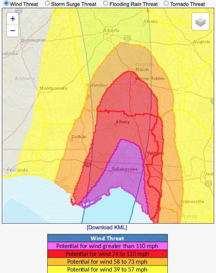 How big the core of the storm is and where exactly it tracks are key questions in the Panhandle and Big Bend, and still not completely resolved. One hopeful sign is that the morning HAFS runs are backing off a little on Helene’s intensity at landfall, aiming more towards the Category 3 range and a slightly smaller (though still 60-80 miles wide) core of destructive hurricane-force winds (see above). Taking the 06z HAFS-B scenario verbatim, that probably translates to 75-95 mph wind gusts in the northwest eyewall and 95-115+ mph gusts in the eastern and northeastern eyewall for inland portions of the eastern Panhandle and Big Bend. Exactly who gets what is still a jump ball, but if Helene makes landfall between St. Marks and Perry as the ensemble mean supports, that would keep Tallahassee in the relatively weaker, but still quite bad northwestern outer eyewall. I’ll be updating those odds tick by tick in the liveblog.