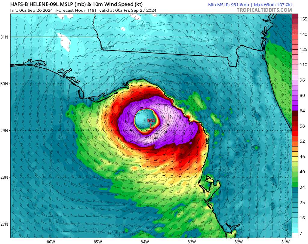 Still, the fact that rapid intensification has been delayed is helpful in shaving a bit of the high-end potential off the hurricane’s core of destructive winds tonight. Recon data also shows Helene has nudged a few miles east of the 5 a.m. NHC track centerline, but not further. I’ll be watching carefully to see if that persists, as every tick east counts towards increasing the potential for Tallahassee staying on the weaker, western half of the storm. Make no mistake: in Tallahassee, your rooting interest is that the center of Helene passes to our east.
