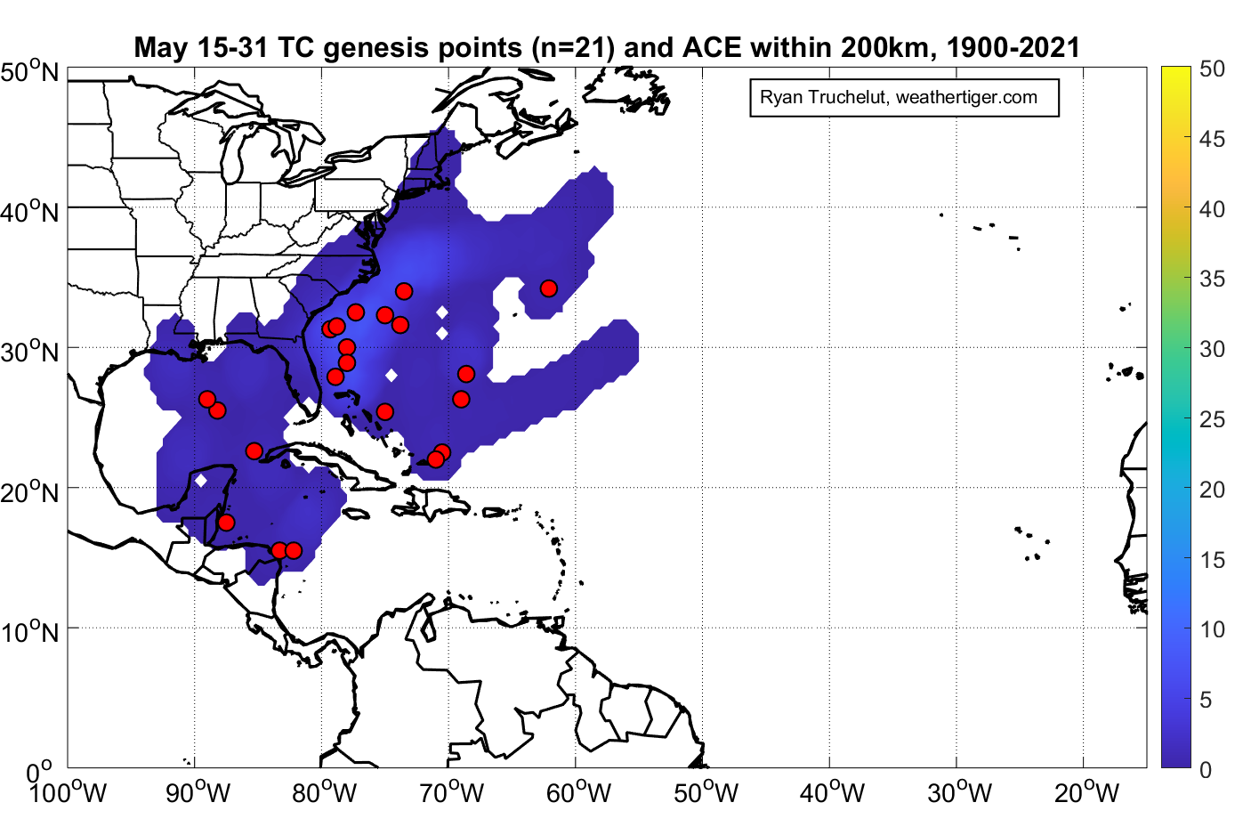 The most common area for development in the second half of May is east of Florida, with a subtropical or tropical storm developing once every 5 to 10 years since 1900. However, pre-season development has been more common in recent decades. U.S. landfalls are rare in May, but the eastern Gulf Coast and Carolinas have seen a handful of May tropical storm hits.