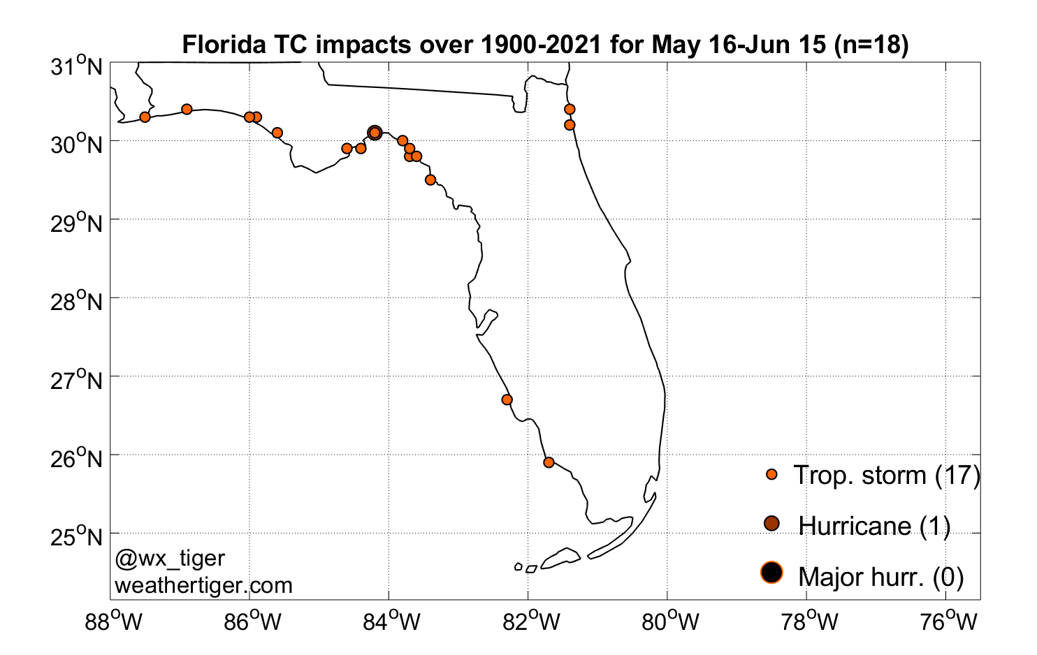 Climatologically, there’s nothing too out of the ordinary going on here. Florida has been struck by 17 tropical storms (and 1 hurricane) in late May or the first half of June since 1900; these systems were almost all sloppy, sheared rainmakers. While the more typical target for early June activity is the Steinhatchee region of the Big Bend, southwestern Florida landfalls are not unprecedented. The most recent reference point is Tropical Storm Barry in 2007. Those who remember Eckerd Drugs and Barnett Bank may also recall 1968’s Tropical Storm Abby.