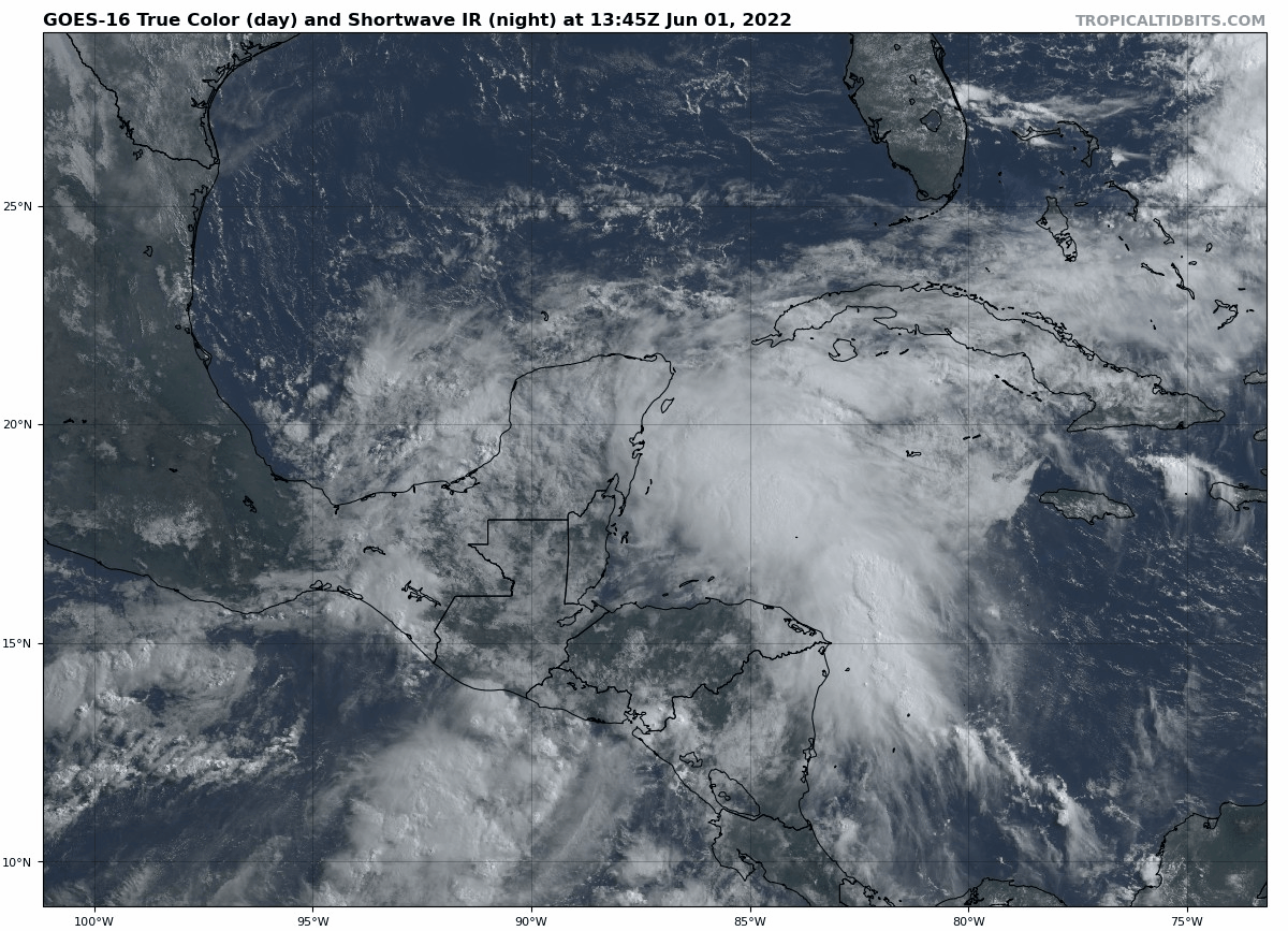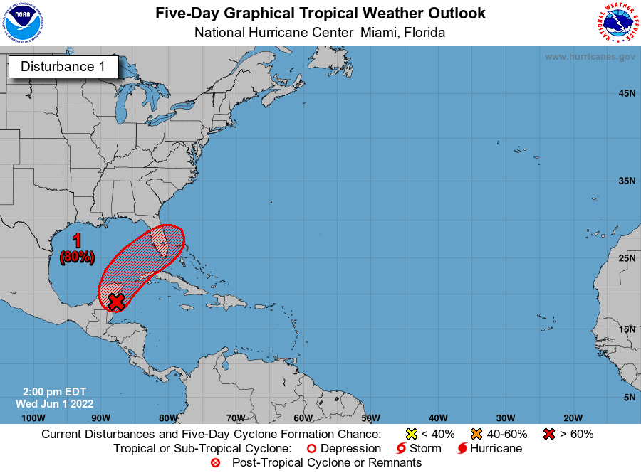Currently, the disturbance of interest is a large area of low pressure across the southern Gulf of Mexico and northwest Caribbean Sea, centered along the eastern shore of the Yucatan peninsula. This system incorporates the remnants of the East Pacific’s Hurricane Agatha, which made landfall in southern Mexico as a strong Category 2 on Monday, as well as the broad low-level rotation associated with a Central American Gyre.