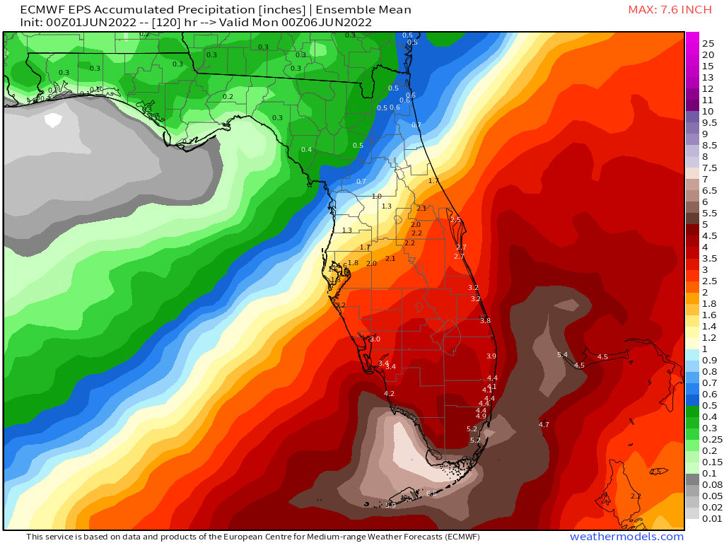 As always, precise forecasting of loosely organized tropical systems is a mug’s game, with impacts minimally dependent on the path of the circulation center. As is typical of early season tropical threats to Florida, wind concerns are expected to be negligible to nuisance-level, while rain impacts will be heavy and widespread. In the relatively more bullish intensity scenarios, coastal wind gusts for Southwest Florida, the Keys, and Southeast Florida top out in the low-end tropical-storm-force range. Gusty winds out of the south could result in coastal flooding in low-lying areas in that region.
