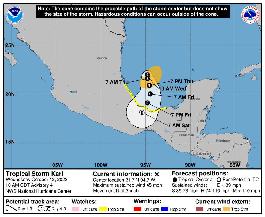 Tropical Storm Karl, a spinoff from Hurricane Julia, will remain safely confined to the southern Gulf of Mexico this week.