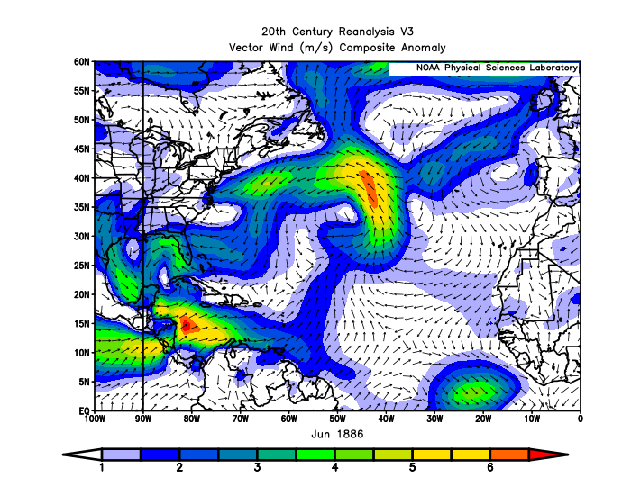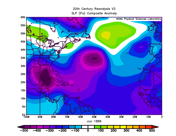 Why was summer 1886 so absurdly hyperactive? While some say the answer is the red-hot debate between Mugwumps, Stalwarts, and Half-Breeds on proposed federal civil service reforms, an extremely strong Central American Gyre is a more likely culprit. All three June hurricanes emerged from the southern Gulf or western Caribbean, where surface pressures were well below normal throughout the month. Unusually weak trade winds in the eastern Pacific also added atypically moist inflow to the gyre convection. That plus a heaping dollop of bad luck led to a bizarre triple-double of June category 2 hurricane strikes.