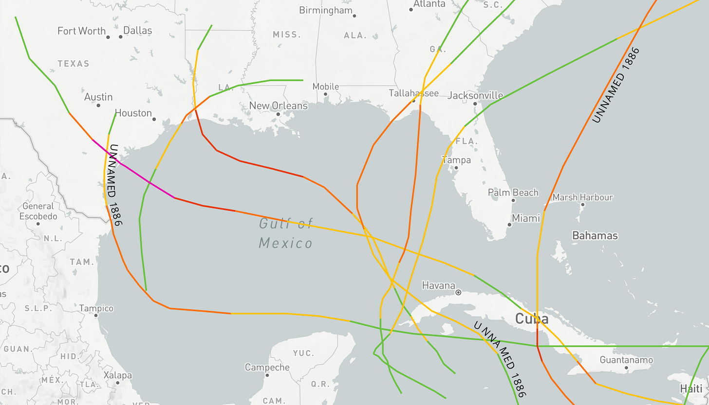 There are a few historical exceptions to this rule in the hurricane history of the late 1800s, particularly the wild hurricane season of 1886. Despite weather observation networks paling in comparison to the modern day, seven separate hurricane landfalls were noted on the U.S. Gulf Coast that year. This remains the single-season record, exceeding the paltry six U.S. hurricane landfalls in 1985, 2004, 2005, and 2020.