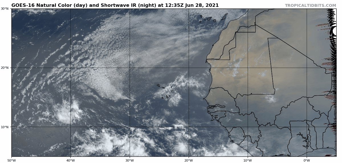 Invest 95L/Central Tropical Atlantic (2-/5-day odds: 20/40%). A tropical wave halfway between Africa and the Lesser Antilles has limited convection this morning, and is struggling as it ingests some drier air to its northwest. Any development will be slow from 95L, and is more likely to occur between 50W and 60W, where early season development is less unprecedented.