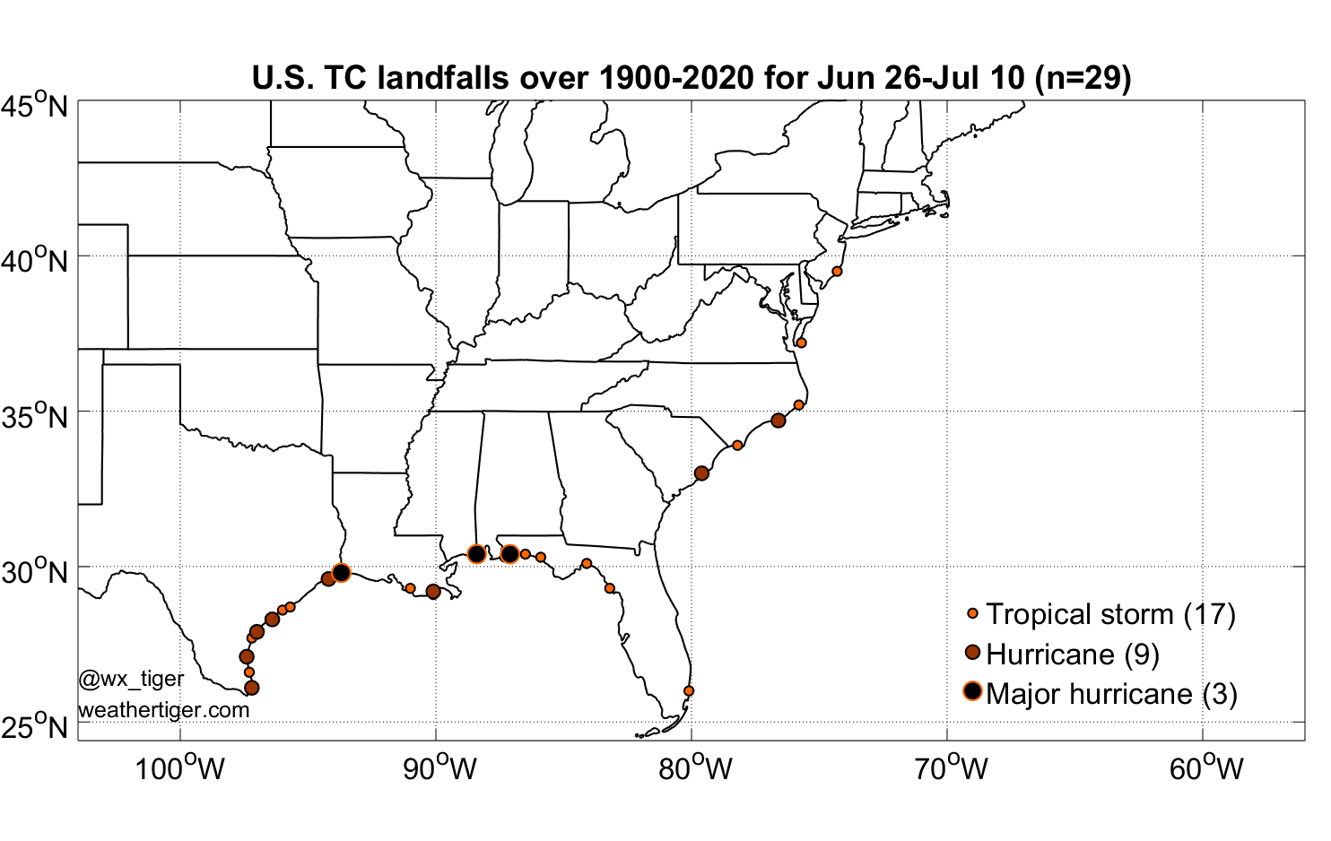On this date in 1913 and again in 1929, Category 1 hurricanes on the Saffir-Simpson Hurricane Wind Scale made landfall in south-central Texas. As shown above, these hurricanes are a fair representation of late June or early July landfalls— typically not too strong, and biased towards the western Gulf Coast.