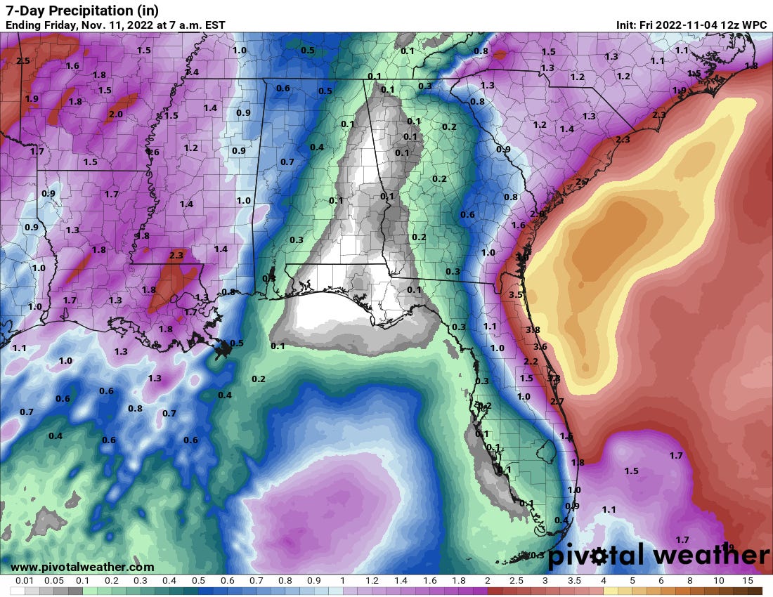 Messy continues to be the operative word. I wouldn’t be concerned about the precise track of the system here, particularly as the stronger winds and heavier rain will be at some remove from the center. However, it looks increasingly likely that Florida (and potentially the coastal Southeast U.S. as well) will see a period of nasty weather between Tuesday and late next week. This certainly bears watching, particularly given that Ian’s river flooding continues and the sensitivity of the Florida peninsula to additional flood risks with even 2-4” inches of widespread rainfall. The current NWS 7-day precip outlook (below) remains conservative in rainfall totals and extent, but could trend farther west over the weekend if model trends continue. Stay tuned.