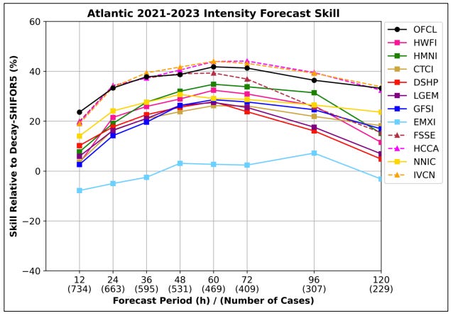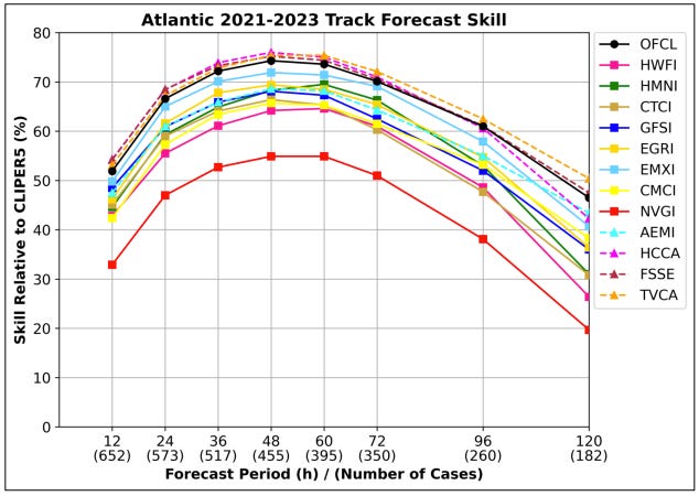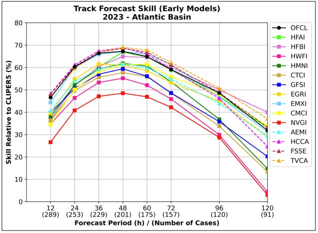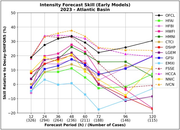 HAFS-A and HAFS-B. The HAFS bros are the next-generation American hurricane models, which moved from experimental to operational status in 2023. HAFS is a major step forward, combining the strengths of global and hurricane-specific modeling, and HAFS-B was the top performer in 2023 at the three- to five-day forecast range. Upgrades to HAFS are continuing, so look for more skill improvements to come. This is the way.