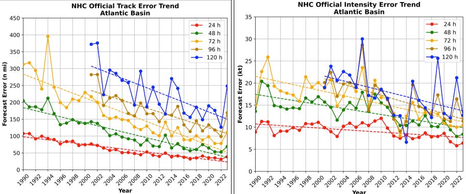 NHC official forecast. Over the past several decades, the National Hurricane Center’s one- to three-day track forecast errors have diminished by 75%, with reductions of about 60% at four- and five-day lead times. Intensity forecasts have also improved, though less dramatically. In the past three years, official National Hurricane Center track and intensity forecasts bested all individual models and equaled the best model blends at all lead times. NHC average forecast errors for the 2023 season were higher than in recent years, mostly due to wackadoo Tropical Storm Philippe’s refusal to curl out to sea in October, so the 2024 cone is a little larger this year than last.