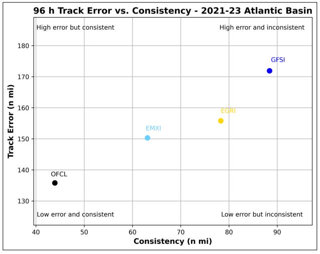 Still, NHC forecasts are far more consistent than any individual model, which typically jump around 75 miles or so each six hours at a four-day lead time. NHC four-day forecasts are not only more skillful than individual models, but shift less than 50 miles on average between advisories. That makes them more accurate than models, and more dependable.
