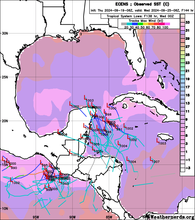 One reason why this potential is worrisome to meteorologists beyond X-treme individual model runs is because the intensity upside potential of the latent disturbance is high. Complex steering may mean slow motion, and that means time. Assessing the likely environment the disturbance will encounter next week is something that models can also provide some meaningful insight into at this range. Taking a look at upper-level winds on the three major ensembles (GFS, Euro, Canadian) below in the middle of next week, the details differ but all guidance suggests winds flowing south to the south and north to the north of the developing low in the northwest Caribbean.