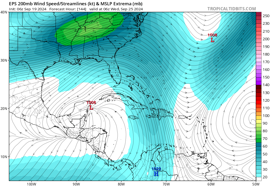 That is a very favorable setup known as “dual-channel outflow” extending all the way south to Venezuela and north into a mid-latitude jet streak over the U.S. Upper South—ideal for generating the massive amounts of rising air underneath the outflow that allows hurricane to develop, organize, and intensify. Something else, like land interaction could get in the way, but right now, the upper-level wind environment looks very, very favorable in the Gulf and Caribbean in the five to ten days out range.