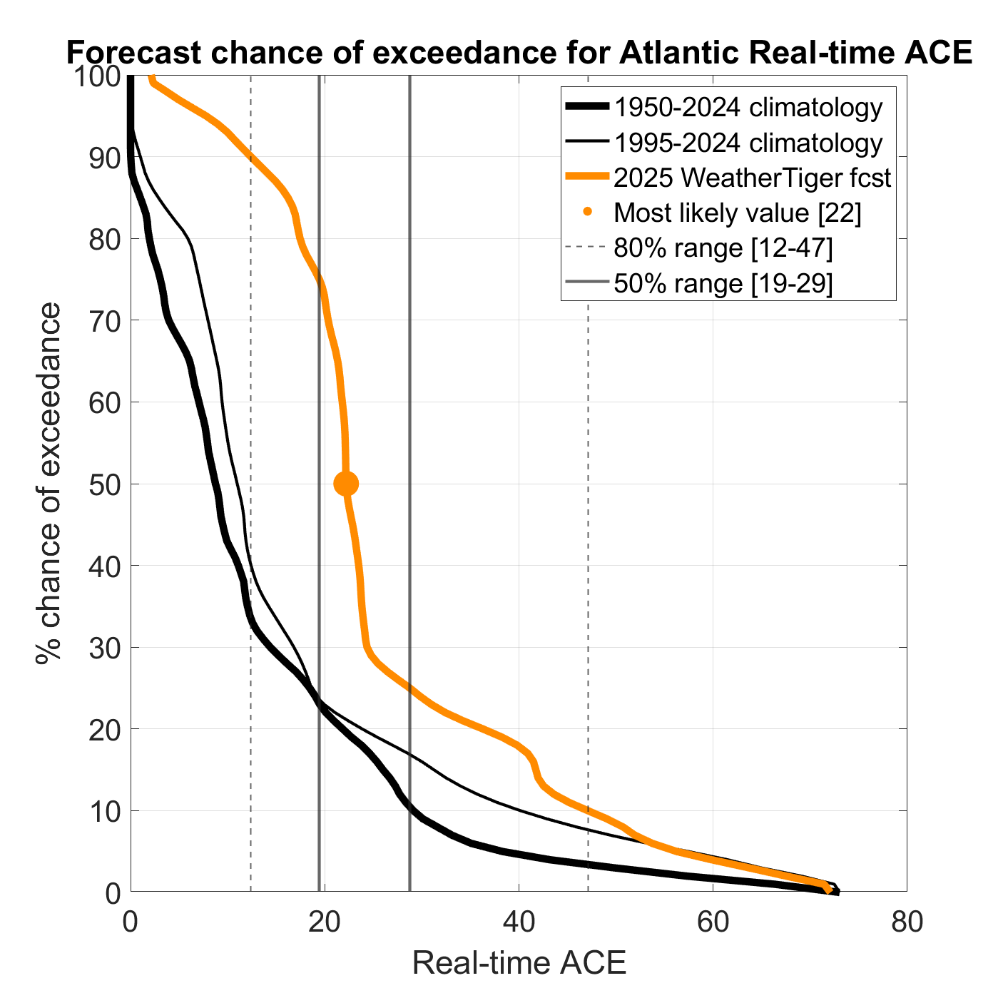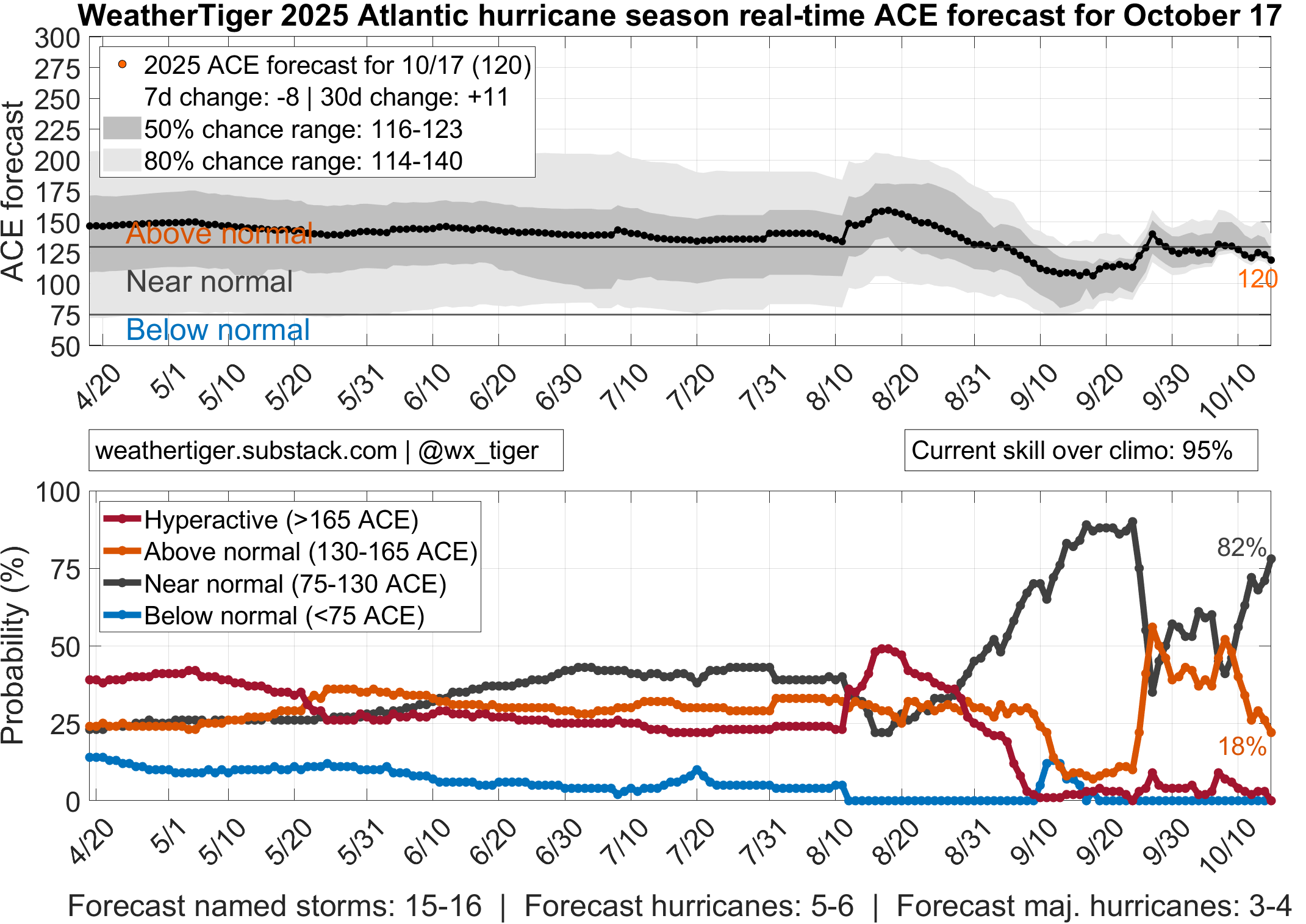 Welcome to WeatherTiger’s real-time modeling page. Live seasonal ACE guidance is freely available below. Real-time U.S. and Florida landfall risk models will remain paid subscriber exclusives through the season. For model methodology details, read our July/August seasonal outlook, including a discussion of U.S. landfall risks.