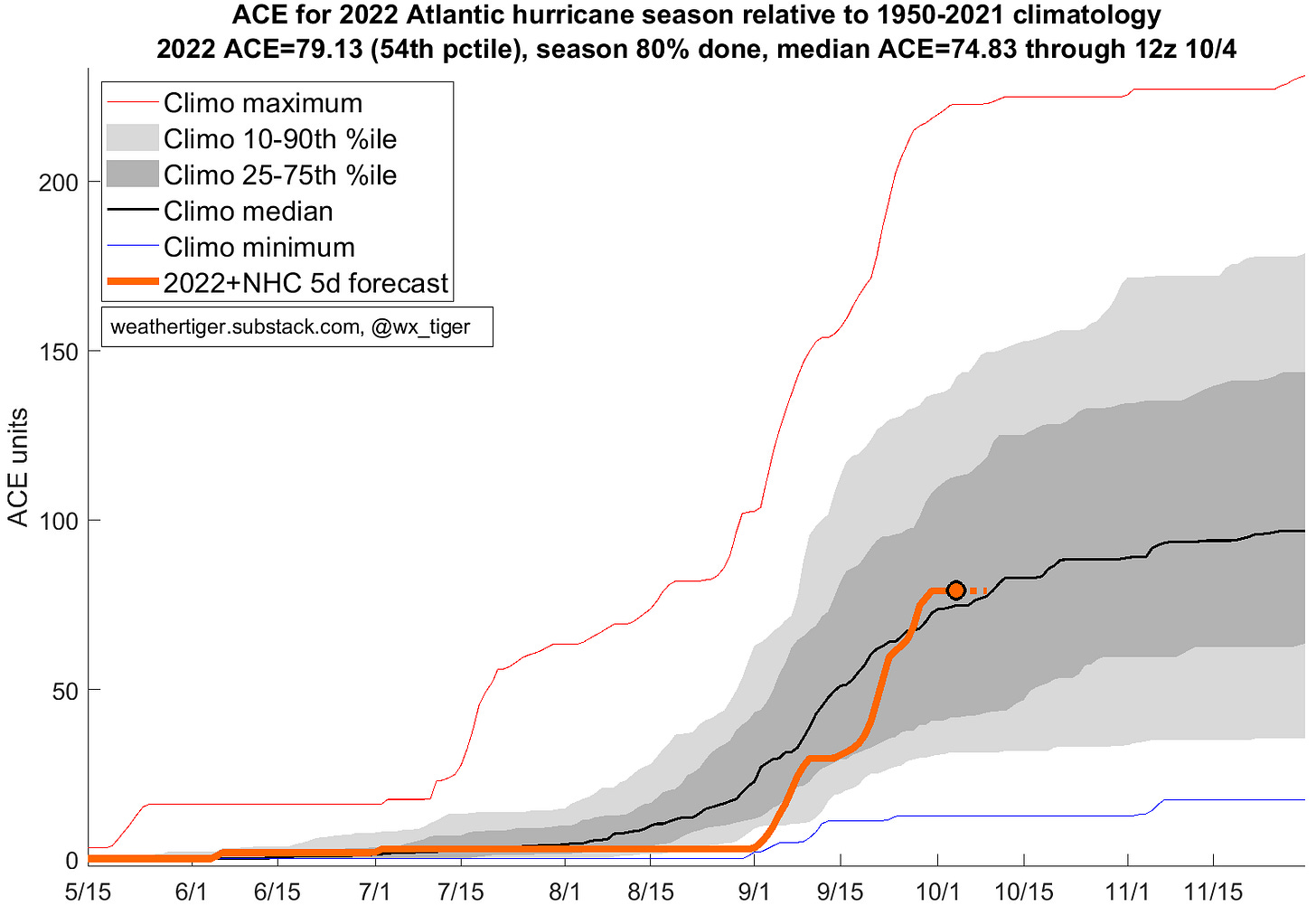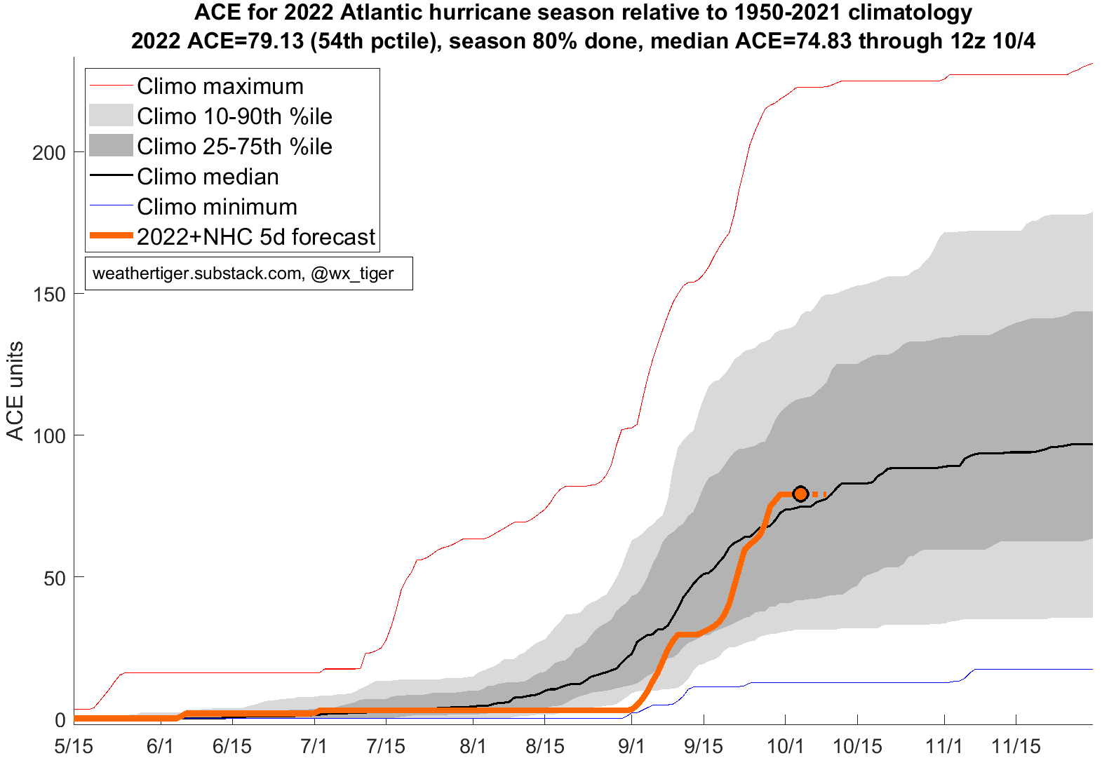 Almanac: It’s Tuesday, October 4th… day 126 of the 2022 hurricane season, 57 days to go. By total storm energy, the season is 79.6%, 85%, and 75.1% complete for the Atlantic, continental U.S., and Florida, respectively.