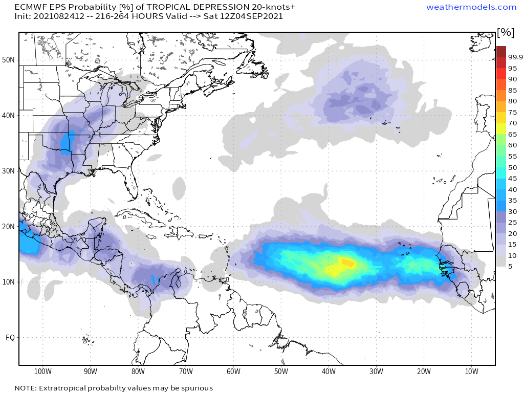 Elsewhere: The western Caribbean may see additional development in the 7-10 day range, which if it comes to fruition could theoretically be more of a potential threat to Florida. The eastern Atlantic is also likely to light up in early September as a convection-supporting upper-atmospheric wave reaches the Main Development Region, as shown on the Euro Ensembles above.